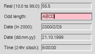 class Demo: def __init__(self, parent): # Create and pack the EntryFields. self._any = Pmw.EntryField(parent, labelpos = 'w', label_text = 'Any:', validate = None, command = self.execute) self._real = Pmw.EntryField(parent, labelpos = 'w', value = '55.5', label_text = 'Real (10.0 to 99.0):', validate = {'validator' : 'real', 'min' : 10, 'max' : 99, 'minstrict' : 0}, modifiedcommand = self.changed) self._odd = Pmw.EntryField(parent, labelpos = 'w', label_text = 'Odd length:', validate = self.custom_validate, value = 'ABC') self._date = Pmw.EntryField(parent, labelpos = 'w', label_text = 'Date (in 2000):', value = '2000/2/29', validate = {'validator' : 'date', 'min' : '2000/1/1', 'max' : '2000/12/31', 'minstrict' : 0, 'maxstrict' : 0, 'format' : 'ymd'}, ) now = time.localtime(time.time()) self._date2 = Pmw.EntryField(parent, labelpos = 'w', label_text = 'Date (d.m.y):', value = '%d.%d.%d' % (now[2], now[1], now[0]), validate = {'validator' : 'date', 'format' : 'dmy', 'separator' : '.'}, ) self._time = Pmw.EntryField(parent, labelpos = 'w', label_text = 'Time (24hr clock):', value = '8:00:00', validate = {'validator' : 'time', 'min' : '00:00:00', 'max' : '23:59:59', 'minstrict' : 0, 'maxstrict' : 0}, ) self._comma = Pmw.EntryField(parent, labelpos = 'w', label_text = 'Real (with comma):', value = '123,456', validate = {'validator' : 'real', 'separator' : ','}, ) entries = (self._any, self._real, self._odd, self._date, self._date2, self._time, self._comma) for entry in entries: entry.pack(fill='x', expand=1, padx=10, pady=5) Pmw.alignlabels(entries) self._any.component('entry').focus_set() def changed(self): print 'Text changed, value is', self._real.get() def execute(self): print 'Return pressed, value is', self._any.get() # This implements a custom validation routine. It simply checks # if the string is of odd length. def custom_validate(self, text): print 'text:', text if len(text) % 2 == 0: return -1 else: return 1