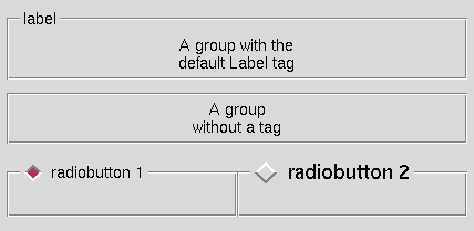class Demo: def __init__(self, parent): # Create and pack the Groups. w = Pmw.Group(parent, tag_text='label') w.pack(fill = 'both', expand = 1, padx = 6, pady = 6) cw = Tkinter.Label(w.interior(), text = 'A group with the\ndefault Label tag') cw.pack(padx = 2, pady = 2, expand='yes', fill='both') w = Pmw.Group(parent, tag_pyclass = None) w.pack(fill = 'both', expand = 1, padx = 6, pady = 6) cw = Tkinter.Label(w.interior(), text = 'A group\nwithout a tag') cw.pack(padx = 2, pady = 2, expand='yes', fill='both') radiogroups = [] self.var = Tkinter.IntVar() self.var.set(0) radioframe = Tkinter.Frame(parent) w = Pmw.Group(radioframe, tag_pyclass = Tkinter.Radiobutton, tag_text='radiobutton 1', tag_value = 0, tag_variable = self.var) w.pack(fill = 'both', expand = 1, side='left') cw = Tkinter.Frame(w.interior(),width=200,height=20) cw.pack(padx = 2, pady = 2, expand='yes', fill='both') radiogroups.append(w) w = Pmw.Group(radioframe, tag_pyclass = Tkinter.Radiobutton, tag_text='radiobutton 2', tag_font = Pmw.logicalfont('Helvetica', 4), tag_value = 1, tag_variable = self.var) w.pack(fill = 'both', expand = 1, side='left') cw = Tkinter.Frame(w.interior(),width=200,height=20) cw.pack(padx = 2, pady = 2, expand='yes', fill='both') radiogroups.append(w) radioframe.pack(padx = 6, pady = 6, expand='yes', fill='both') Pmw.aligngrouptags(radiogroups) w = Pmw.Group(parent, tag_pyclass = Tkinter.Checkbutton, tag_text='checkbutton', tag_foreground='blue') w.pack(fill = 'both', expand = 1, padx = 6, pady = 6) cw = Tkinter.Frame(w.interior(),width=150,height=20) cw.pack(padx = 2, pady = 2, expand='yes', fill='both') w = Pmw.Group(parent, tag_pyclass = Tkinter.Button, tag_text='Tkinter.Button') w.pack(fill = 'both', expand = 1, padx = 6, pady = 6) cw = Tkinter.Label(w.interior(), background = 'aliceblue', text = 'A group with\na Button tag!?' ) cw.pack(padx = 2, pady = 2, expand='yes', fill='both')