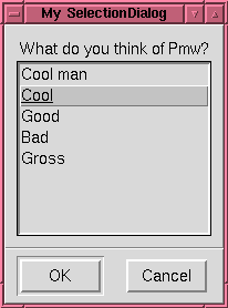 class Demo: def __init__(self, parent): # Create the dialog. self.dialog = Pmw.SelectionDialog(parent, title = 'My SelectionDialog', buttons = ('OK', 'Cancel'), defaultbutton = 'OK', scrolledlist_labelpos = 'n', label_text = 'What do you think of Pmw?', scrolledlist_items = ('Cool man', 'Cool', 'Good', 'Bad', 'Gross'), command = self.execute) self.dialog.withdraw() # Create button to launch the dialog. w = Tkinter.Button(parent, text = 'Show selection dialog', command = self.dialog.activate) w.pack(padx = 8, pady = 8) def execute(self, result): sels = self.dialog.getcurselection() if len(sels) == 0: print 'You clicked on', result, '(no selection)' else: print 'You clicked on', result, sels[0] self.dialog.deactivate(result)