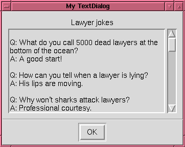 class Demo: def __init__(self, parent): # Create the dialog. dialog = Pmw.TextDialog(parent, scrolledtext_labelpos = 'n', title = 'My TextDialog', defaultbutton = 0, label_text = 'Lawyer jokes') dialog.withdraw() dialog.insert('end', jokes) dialog.configure(text_state = 'disabled') # Create button to launch the dialog. w = Tkinter.Button(parent, text = 'Show text dialog', command = dialog.activate) w.pack(padx = 8, pady = 8) jokes = """ Q: What do you call 5000 dead lawyers at the bottom of the ocean? A: A good start! Q: How can you tell when a lawyer is lying? A: His lips are moving. Q: Why won't sharks attack lawyers? A: Professional courtesy. Q: What do have when a lawyer is buried up to his neck in sand? A: Not enough sand. Q: How do you get a lawyer out of a tree? A: Cut the rope. Q: What is the definition of a shame (as in "that's a shame")? A: When a bus load of lawyers goes off a cliff. Q: What is the definition of a "crying shame"? A: There was an empty seat. Q: What do you get when you cross the Godfather with a lawyer? A: An offer you can't understand. Q. What do lawyers use as contraceptives? A. Their personalities. Q. What's brown and black and looks good on a lawyer? A. A doberman. Q. Why are lawyers buried 12 feet underground? A. Deep down their good. Q. What's the difference between a catfish and a lawyer? A. One's a slimy scum-sucking scavenger, the other is just a fish. """