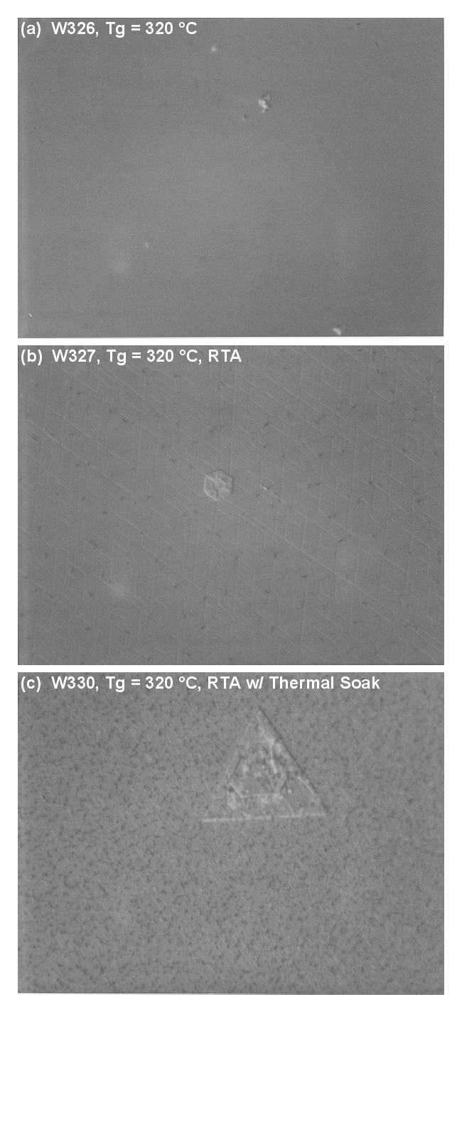 FIG. 5 Optical Microscope and Atomic Force Microscope (AFM) pictures of the BaF2 layers grown at 320oC with and without rapid thermal anneals (RTA) and thermal soaks.