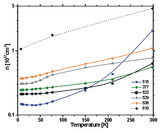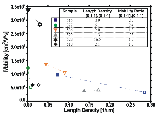Figure 4 shows the electron mobility for several different quantum well samples versus temperature. The mobility in the [110] and [1-10] directions are shown by open and solid symbols, respectively. The quantum well samples show, to varying degrees, the increase in mobility for a reduction in temperature of the form expected for remotely-doped quantum-well samples. For temperatures from 300 to 77 K the increase in mobility results from the reduction in the effects of phonon scattering, while the saturation observed for still lower temperatures corresponds residual effects of impurities and structural defects. At 7K large discrepancies in the mobility in the [1-10] and [110] directions are observed for two samples with moderate mobility (S523 and S515). The higher mobility is observed in the [1-10] direction. Little anisotropy is observed for the low mobility quantum well and bulk film (S529 and S610, respectively).