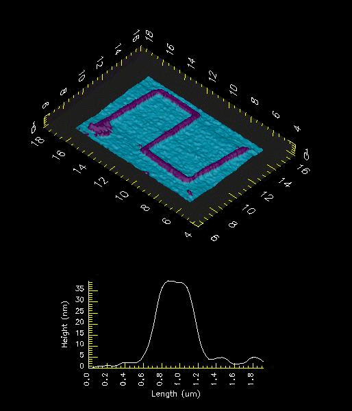 Fig 2: AFM image of NSOM generated pattern. This pattern was produced with the probe in close proximity to the sample but with no optical illumination. The linecut below the image shows the linewidth and height of the sample.