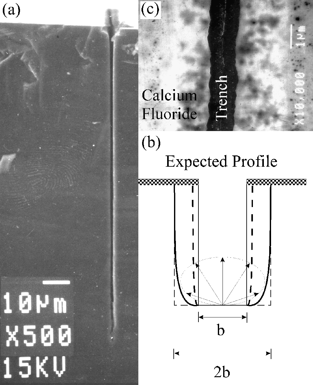 (a) Cross-sectional SEM view of a 1 mm wide, 120 mm-deep, CaF2-masked trench in Si(100). The trench was fluorine etched for 100 minutes at a substrate temperature of 500oC. (b) Shows a plot of the expected profile assuming a cosine distribution for reactive species scattered at the bottom of the trench with the solid (dotted) line for full (20%) reactivity. (c) Shows a top view of the trench and the CaF2 mask, as labeled. Note the pinholes in the CaF2 mask.