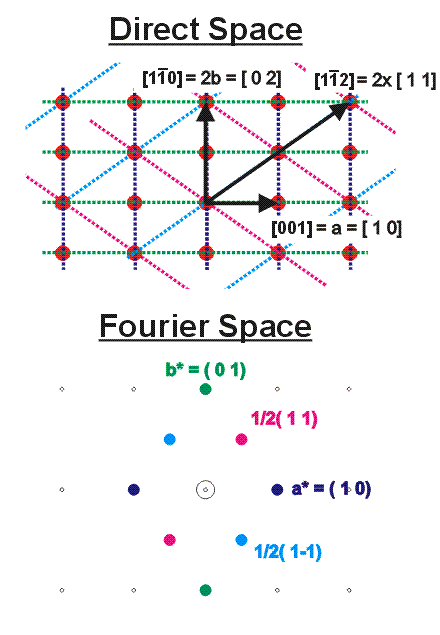 The direct space diagram shows the usual GaAs(110) 2-D rectangular lattice.  To show the connection between this 2-D lattice to its Fourier representation, two dimensional  indices are introduced, such that, [001] or a is [ 1 0], and [ 1-1 0] or 2 x b is 2 x [ 0 1].  With this two dimensional representation, the meaning of the indexed diffraction spots becomes clearer (hopefully).